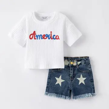 Upgrade your little girl's summer wardrobe with our Girls "America" Top+Denim Shorts Set! Featuring a stylish and patriotic design, this set is perfect for Fourth of July festivities or any sunny day. Made from high-quality materials, it offers both comfort and durability. Your little one will love showing off her American spirit in this adorable set.