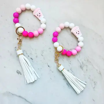 The wristband keyring is made with silicone beads, split ring, clasp, and leather tassel. The wristband keychain makes it easy for you to have your keys and wallet attached to your wristband, which easily slides onto your wrist!
