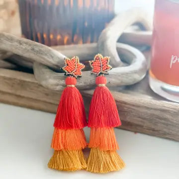 Have you been looking for the perfect accessory to complete your fall festival look? Look no further than these stunning Fall Festival Tassel Earrings! With a beaded leaf design and made of 3 vibrant colors, these earrings will be sure to turn heads. Measuring approximately 4-1/2", these earrings will be the perfect addition to your autumn wardrobe.