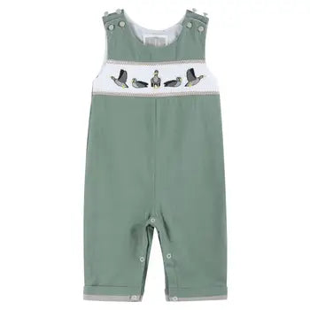 Introduce a whole lot of cuteness into his closet with our Sage Green Mallard Smocked Overalls – the perfect outfit for your little duckling! Featuring charming smocking on the chest and adorable embroidered mallards, these overalls are simply 'duck'tastic. Make a splash with style as your sweet boy waddles through the day in this irresistibly cute ensemble!