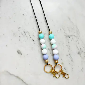 Lanyard is made with five 15 mm silicone beads, two 12 mm gold silicone beads, split ring, clasp. The lanyard makes it easy for you to attach your keys, school ID, or anything you need easily accessible throughout your day! The lanyard hangs on black premium quality nylon satin cord.