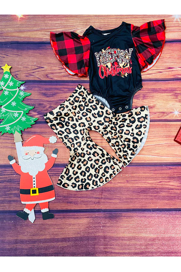 - Top features "Merry Christmas " wording w/leopard prints on black background & plaid ruffle long sleeve cut baby romper.