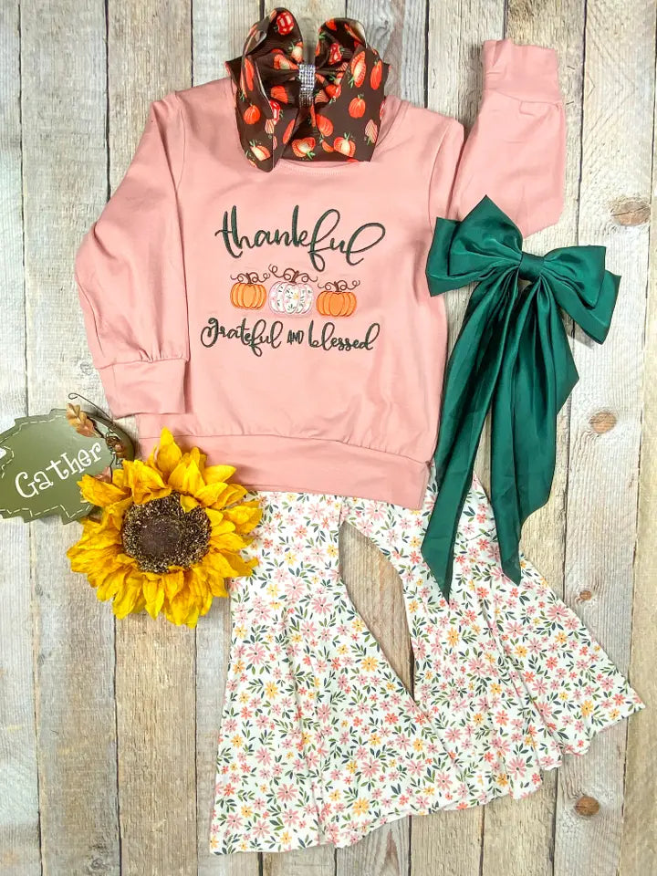 Celebrate the season of gratitude in style with our Thankful, Grateful & Blessed Bell Bottom Set! 🍁 This cozy and cute 2-piece outfit is designed to keep your little one comfortable and festive all fall long. The long-sleeve top features the heartfelt “Thankful, Grateful & Blessed” message in warm, inviting colors—perfect for Thanksgiving dinners, family photos, or casual autumn days. Paired with soft, stretchy bell bottoms that have just the right flare, this set is as comfortable as it is adorable.